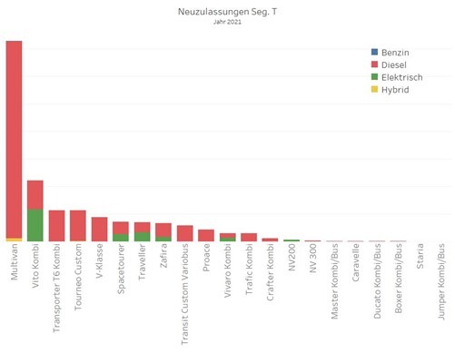 Das Segment T, das 2021 etwa 3,5% Marktanteil am Gesamt-Pkw-Markt (vs. 3,1% im Jahr 2020) erreichte, wird vom VW Multivan dominiert. Mit großem Abstand folgt der Mercedes Vito Kombi bzw. die luxuriöser ausgestattete V-Klasse, sowie der VW T6 Kombi und der Ford Tourneo Custom. Mit dem Hyundai Staria kam im Vorjahr ein designtechnisch sehr auffälliges Modell hinzu.