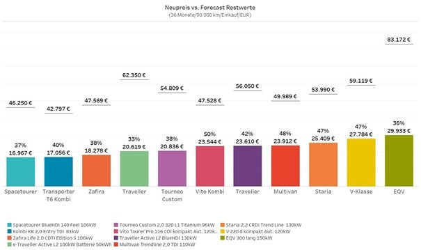 Bezüglich Wertstabilität halten sich diese Kombi/Busse, die bis zu 9 Sitzplätze bzw. viel Stauraum bieten, ganz gut und erzielen als 3-jährige Gebrauchte mit 90.000 km durchschnittliche Restwerte von 60 % (im Verkauf). Vor allem die beiden Topseller Multivan und V-Klasse erfreuen sich sehr hoher Nachfrage und werden nach 36 Monaten mit rund 67 % bzw. 63,5 % gehandelt. Natürlich wirkt sich auch in diesem Segment die deutliche Angebotsverknappung aus – im Vergleich zum Jahresbeginn 2021 liegen die Verkaufspreise für 3-jährige GW aktuell um ca. 6,5 Prozentpunkte höher. Am folgenden Forecast-Chart ist die Entwicklung für 36 Monate/90.000 km im Einkauf abgebildet. Hier zeigen sich analog zu den GW-Werten hohe Restwerte für Multivan, Vito Kombi und V-Klasse. Die Prognosen für die Elektroversionen liegen aufgrund der bis dahin zu erwartenden technologischen Weiterentwicklung betreffend Akkugröße, Ladegeschwindigkeit und Reichweiten sowie der aktuell noch relativ hohen Anschaffungspreise dementsprechend tiefer.